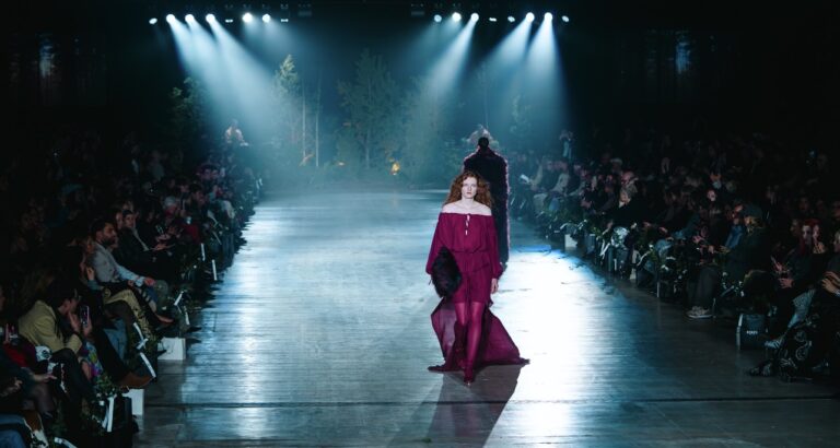 Die Silhouetten sprechen eine skulpturale Formensprache und unterstreichen die dramatische Wirkung des Konzepts. Gleichzeitig wird deutlich: Bei dieser Präsentation geht es nicht allein um Mode – sondern um eine künstlerische Gesamtwelt, in die das Publikum eintauchen soll.