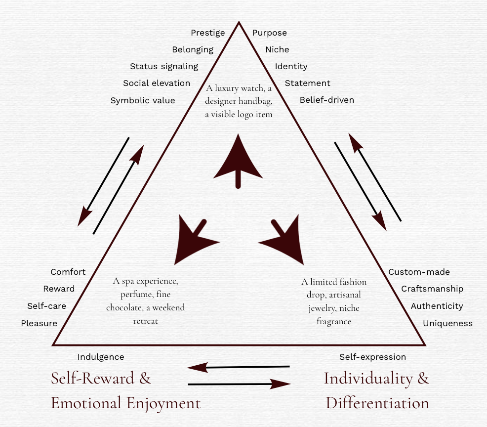 Die Pfeile im Modell verdeutlichen, dass sich diese drei Hauptmotive nicht strikt voneinander trennen lassen. Vielmehr besteht eine Wechselwirkung: Ein Produkt kann gleichzeitig Status vermitteln, emotional belohnen und individuelle Werte ausdrücken. Die Übergänge zwischen den Polen sind fließend, was die Vielschichtigkeit und psychologische Komplexität von Luxusentscheidungen verdeutlicht.