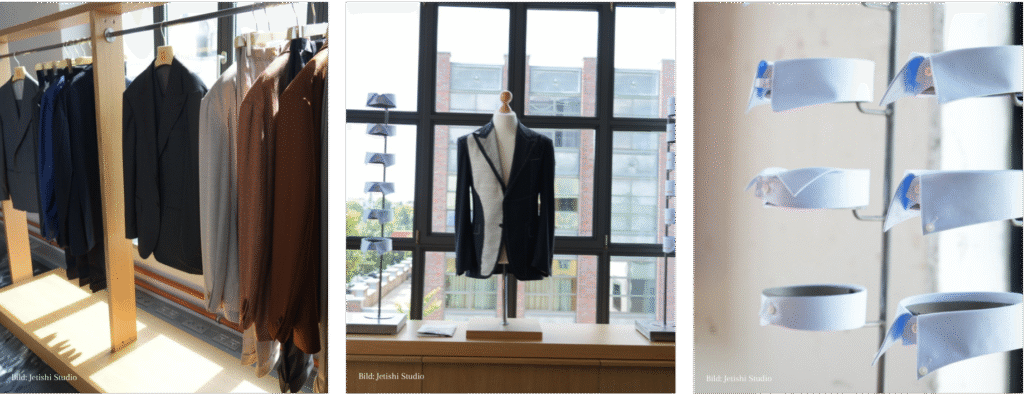 Ein Anzug ist für Gezim Jetishi kein Produkt von der Stange, sondern das Ergebnis eines intensiven Prozesses: Anproben, Konfiguration, intensive Gespräche und Verständnis für den Kunden, bis hin zur Feinarbeit. Und genau das gehört für ihn dazu. Wer sich hier etwas anfertigen lässt, genießt den Luxus der Zeit, des Komforts und der Individualisierung. Am Ende bekommt man dafür aber nicht irgendein Kleidungsstück, sondern eines, das wirklich sitzt, körperlich und persönlich.
