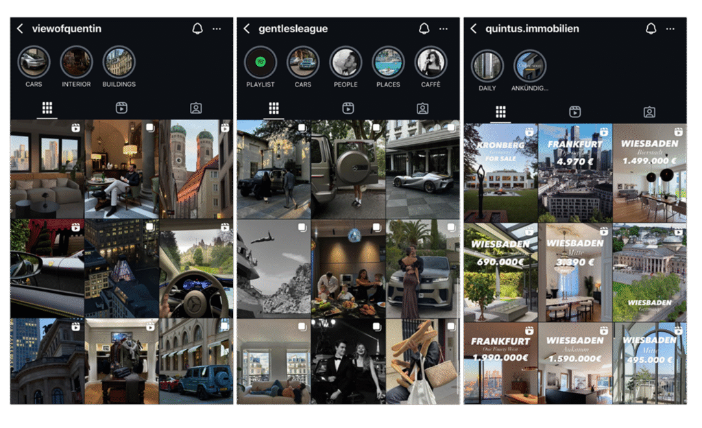 Doch irgendwann reichte das reine Zusammenstellen inspirierender Inhalte nicht mehr. Schäfer wollte eigene Inhalte schaffen, mit persönlicher Handschrift. So entstanden @viewofquentin, ein Account mit regionalem Fokus, persönlicher Perspektive und fotografischem Anspruch. Später kam @quintus.immobilien hinzu, ein nicht nur ästhetischer, sondern auch geschäftlich orientierter Kanal, auf dem er exklusive Immobilien des Rhein-Main-Gebiets veranschaulicht und vermarktet, immer noch mit seiner typischen Ästhetik im Auftritt.
