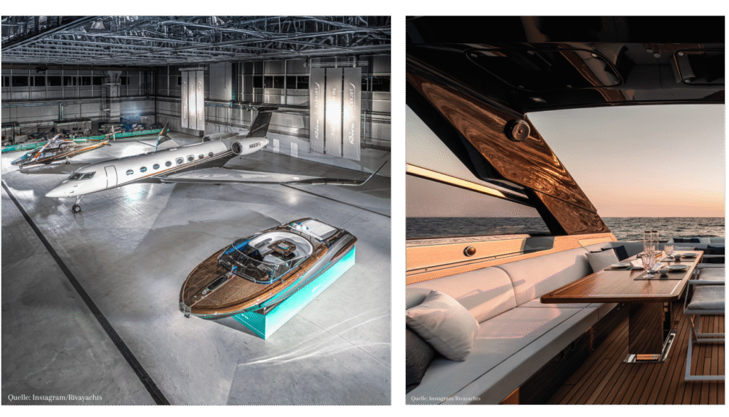 Exclusive Luxury steht für Marken, die nur für einen sehr kleinen Kreis zugänglich sind. Mit maßgeschneiderten Produkten, extrem limitierten Partnerschaften und einem hohen Anspruch an Status, Rarität und Individualisierung. „RIVA VOLARE“ bewegt sich genau in diesem Segment: Eine Verbindung aus Privatjet und Yacht, die nicht nur Luxus transportiert, sondern Teil eines Lebensstils ist, den sich nur wenige leisten und bewusst pflegen.